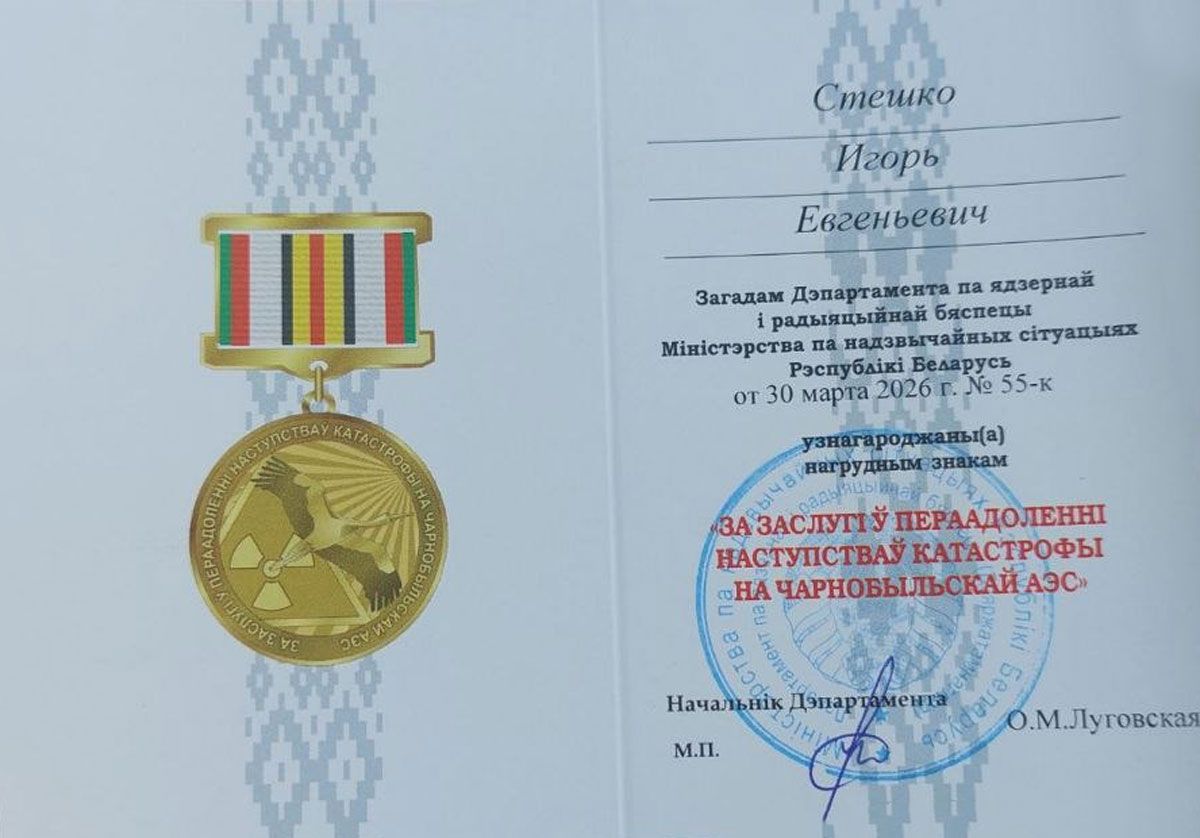 Приказом Департамента по ядерной и радиационной безопасности Министерства по чрезвычайным ситуациям Республики Беларусь от 30 марта 2026 года №55-к Стешко Игорь Евгеньевич награжден нагрудным знаком «За заслуги в преодолении последствий катастрофы на Чернобыльской АЭС».