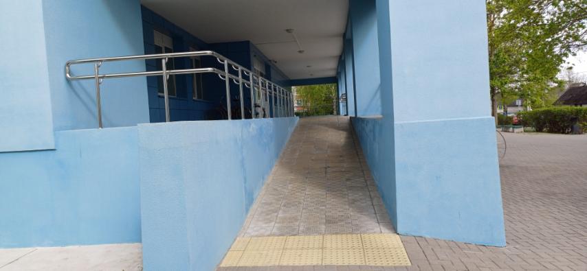 Все входы в здание оборудованы пандусом и поручнями; расширены дверные проёмы, имеются площадки для разворота на пути перемещения пациентов.