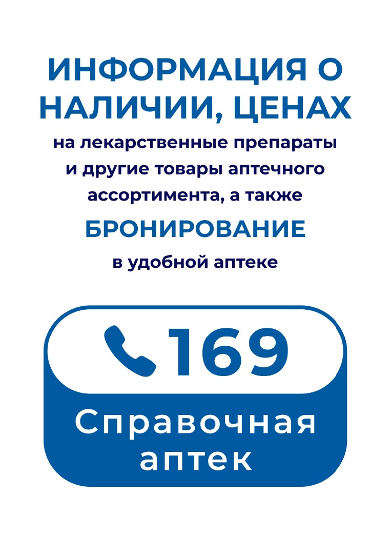 Звонок по номеру 169 позволяет уточнить наличие и стоимость лекарственных препаратов, медицинских изделий и других товаров аптечного ассортимента, а также осуществить бронирование в удобной аптеке.